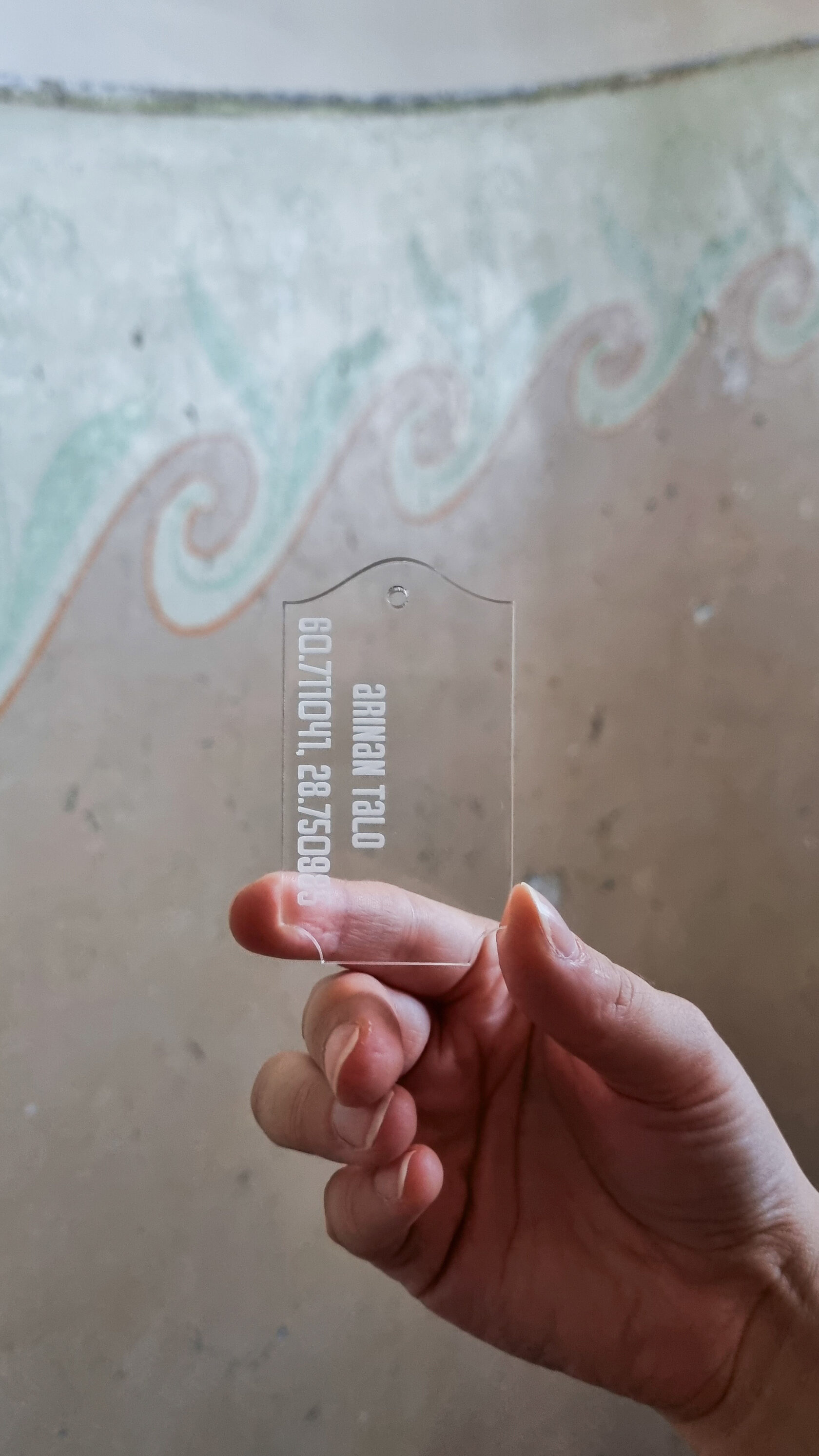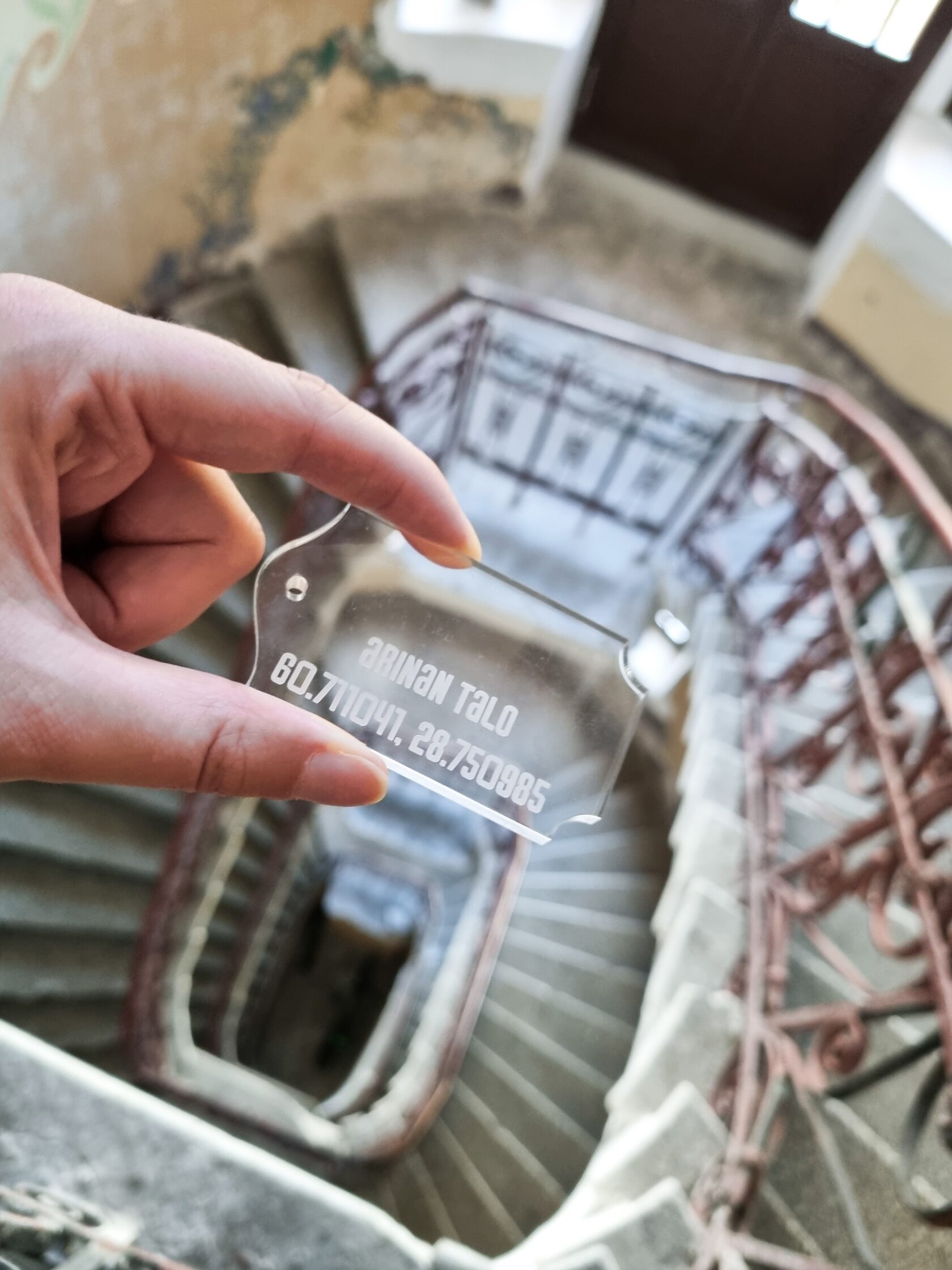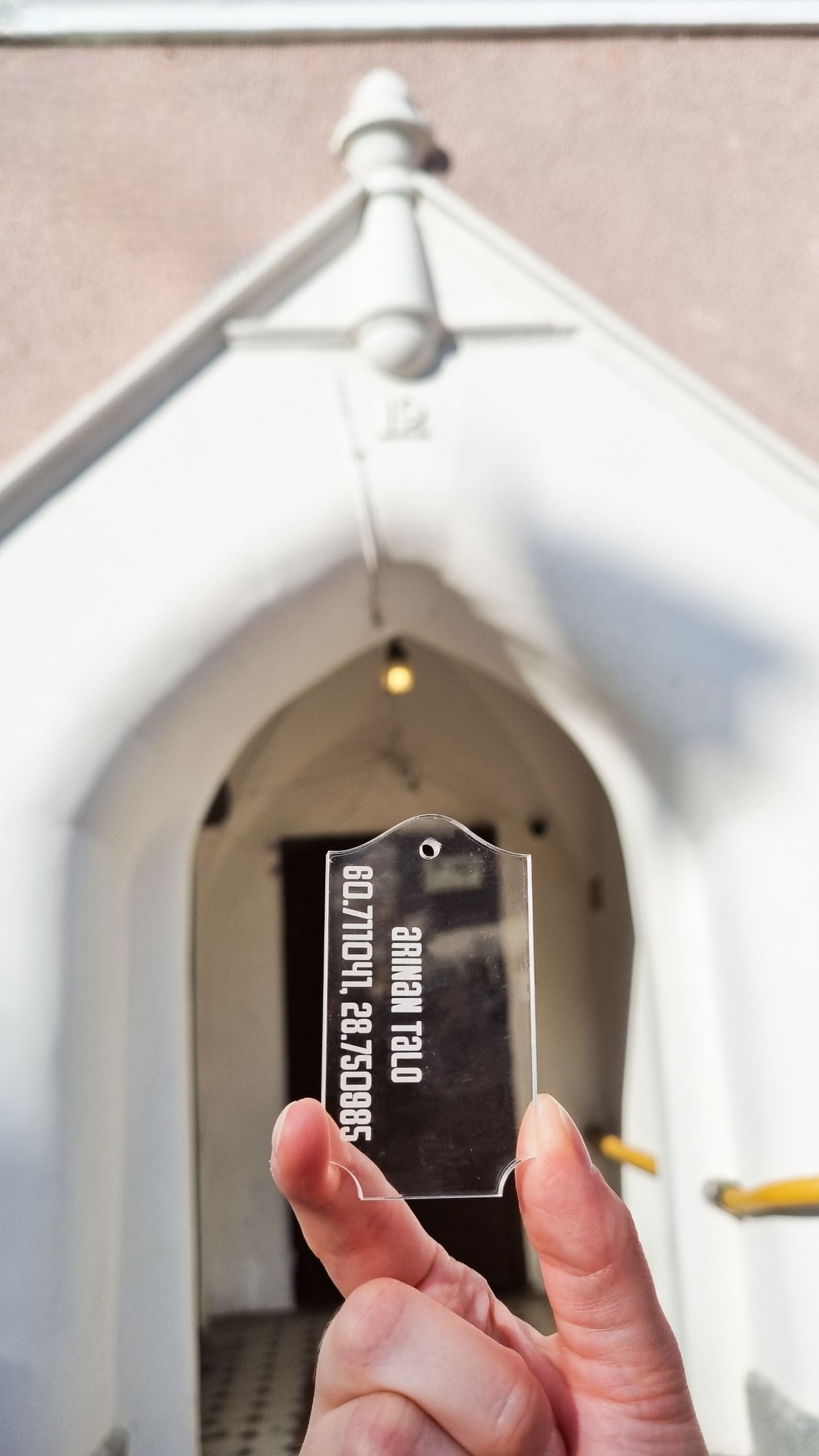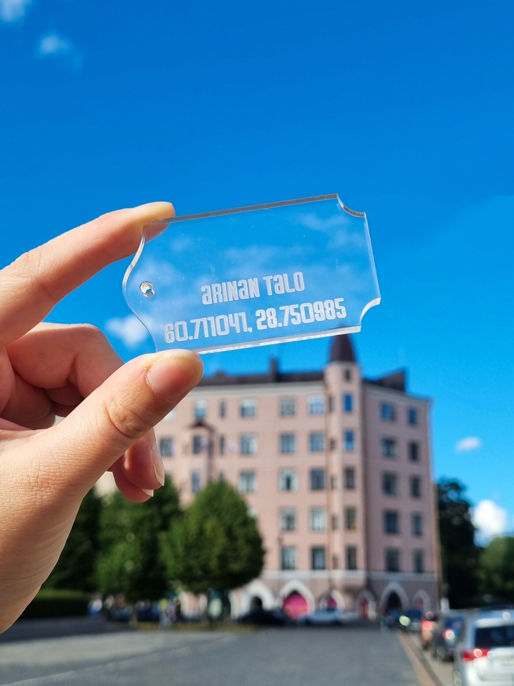 Это брелок, формой и материалом отсылающей к стеклу в дверях по эскизу архитектора дома, Аллана Шульмана. Надпись на брелке — координаты дома и его название на финском языке. Брелок изготовлен из прозрачного акрила, крепится на металлический тросик (в комплекте). Размеры брелка — 7x4 см, толщина 5 мм.