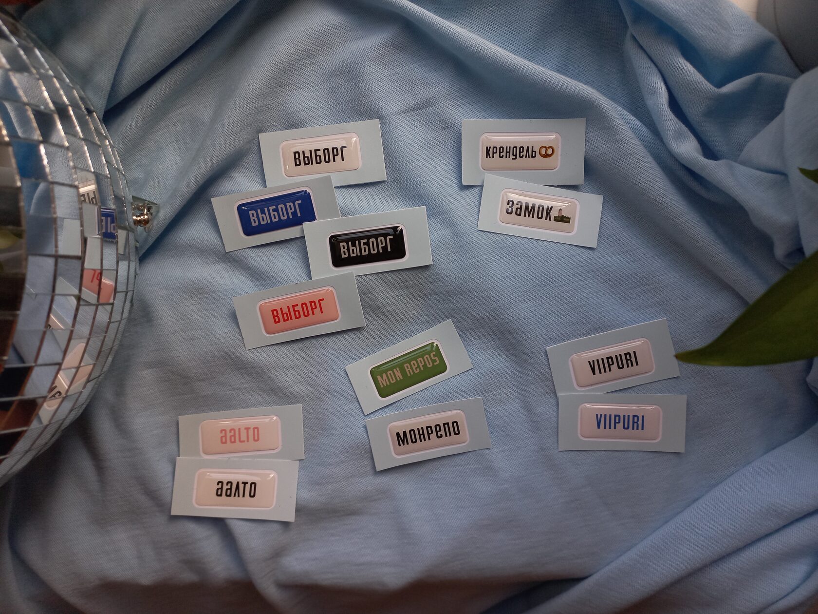 Стикеры разных размеров (в см, примерно): адресная табличка «улица Чернаго братства» — 5.5x2.9 накладка на почтовый ящик «KIRJEITÄ» — 6.2x1.5 значок-сердечко — 3х2 русалка — 5.2х2 плитка-цветочек — 3.7х3.7 осколок печного изразца — 4.4х3 VIIPURI — 3.2х1.2